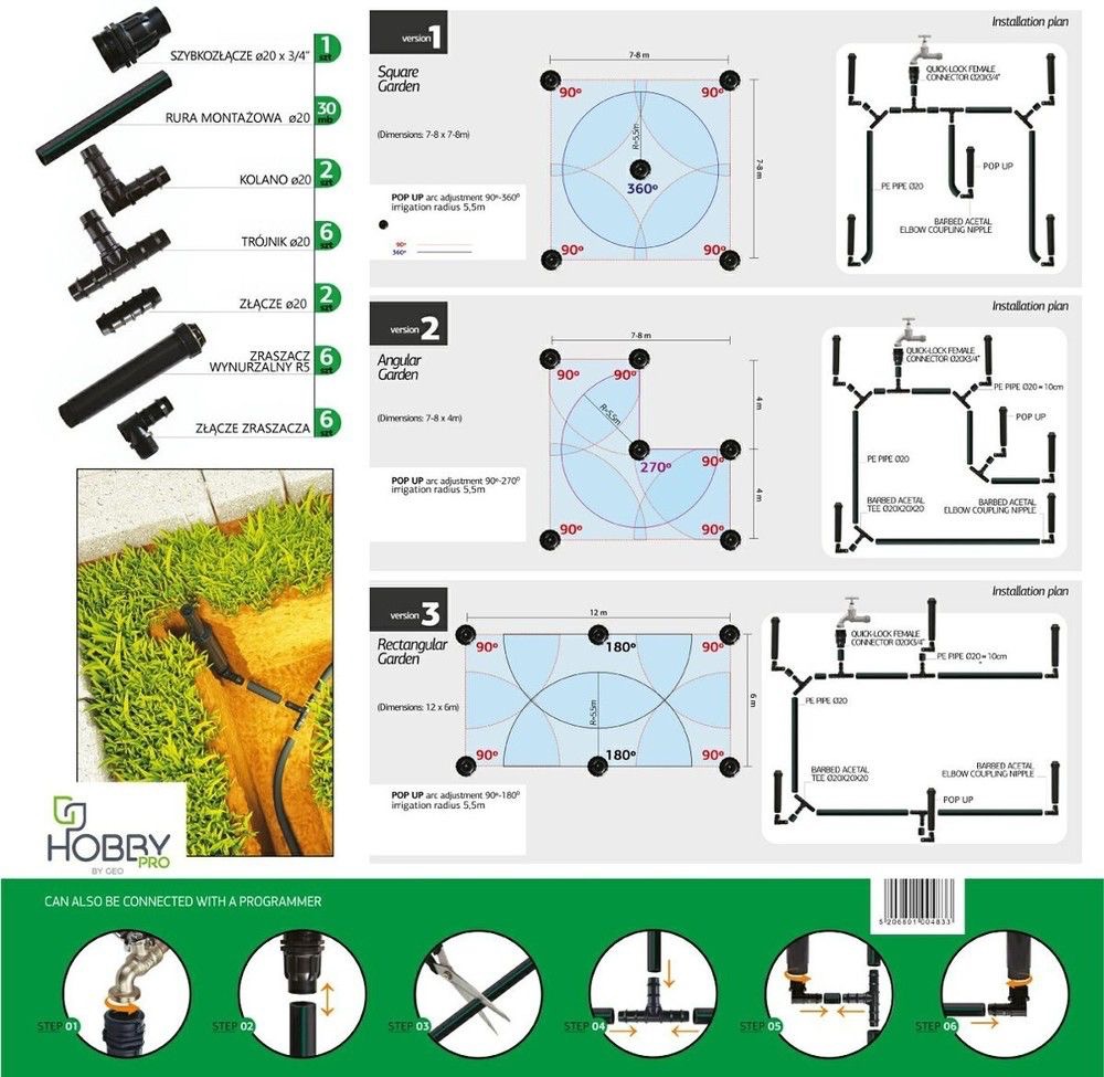Avantaje:✔ Instalare rapidă și ușoară – nu necesită cunoștințe avansate✔ Eficiență maximă – distribuție uniformă a apei✔ Reglaj personalizat – aspersoarele permit ajustarea jetului între 0° și 360°✔ Materiale durabile – rezistente la presiune și condiții de mediu